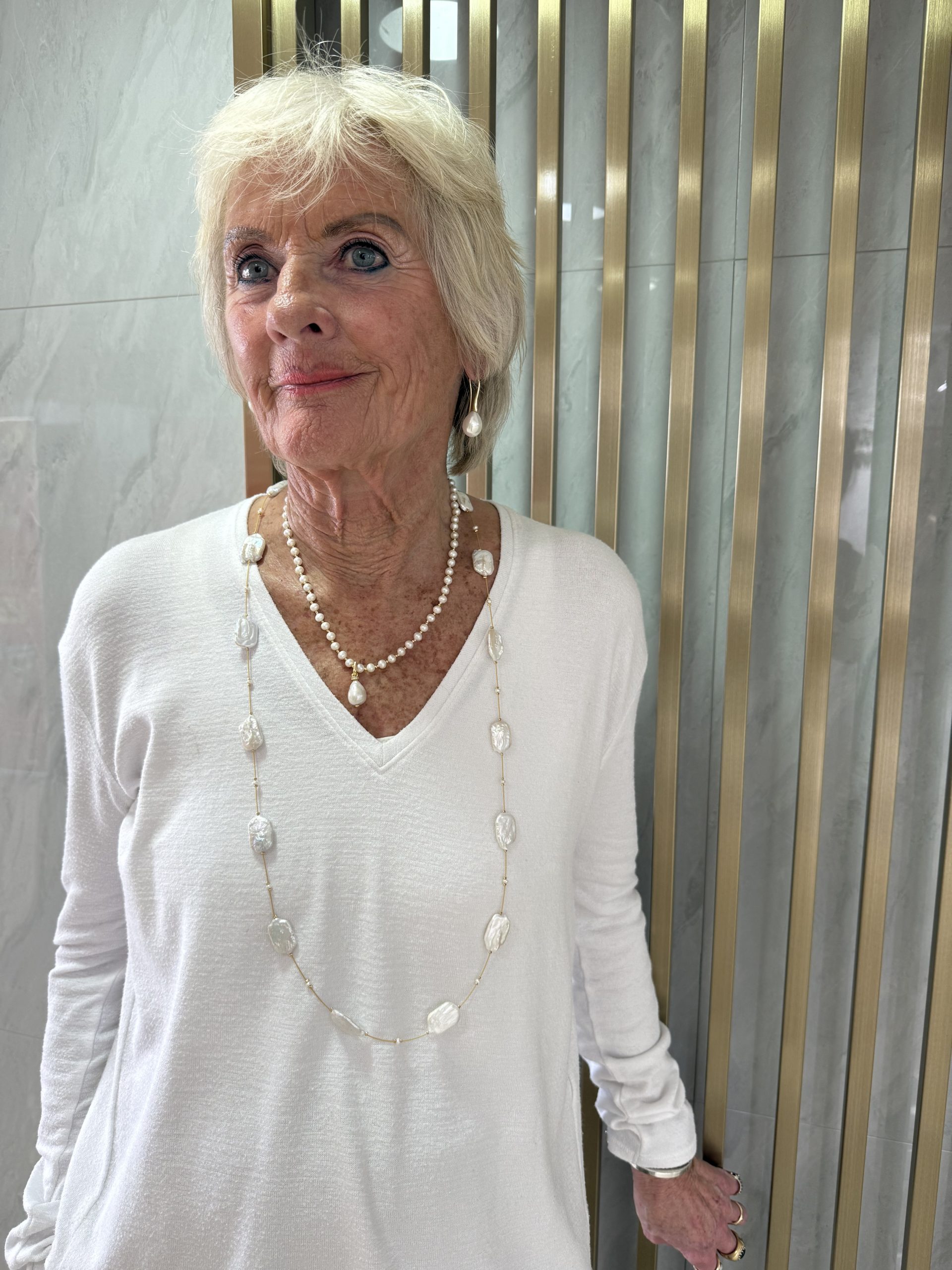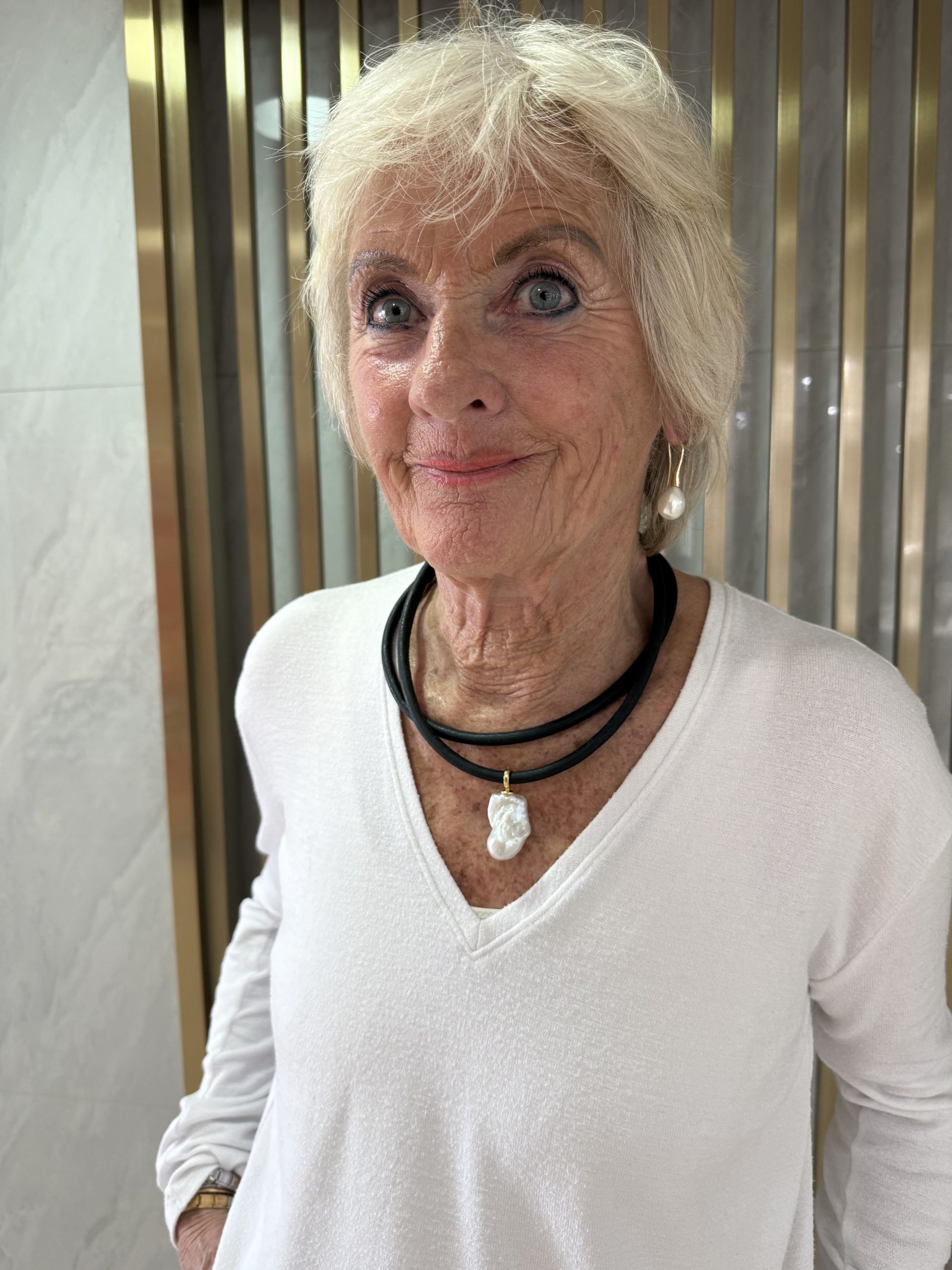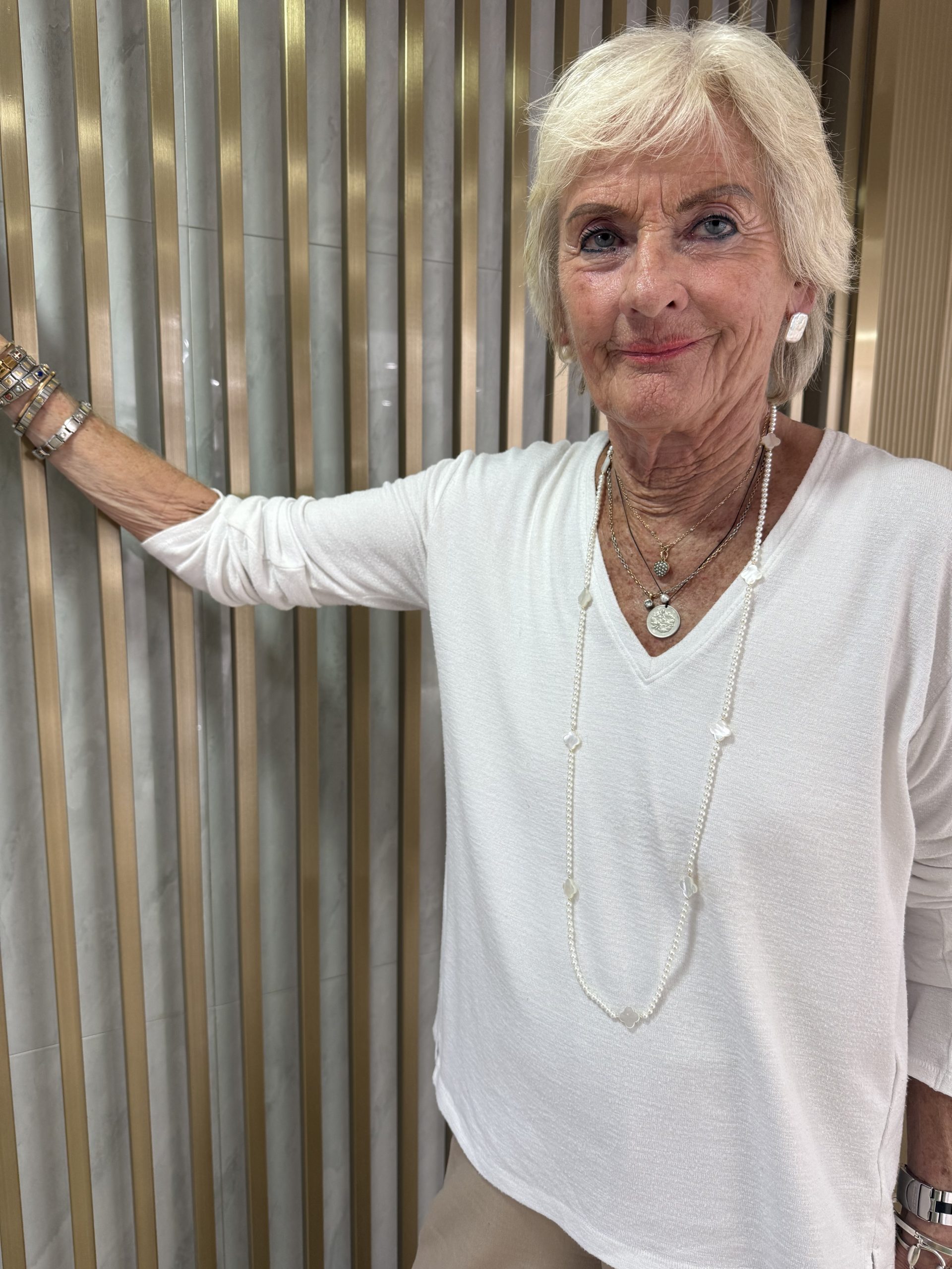 New this season are the resin “zero” chokers and pendants in vibrant colours. The latest from Italy are “stars”. Wood and silver ropes are also featured to wear with the pleats, cashmere or linen.