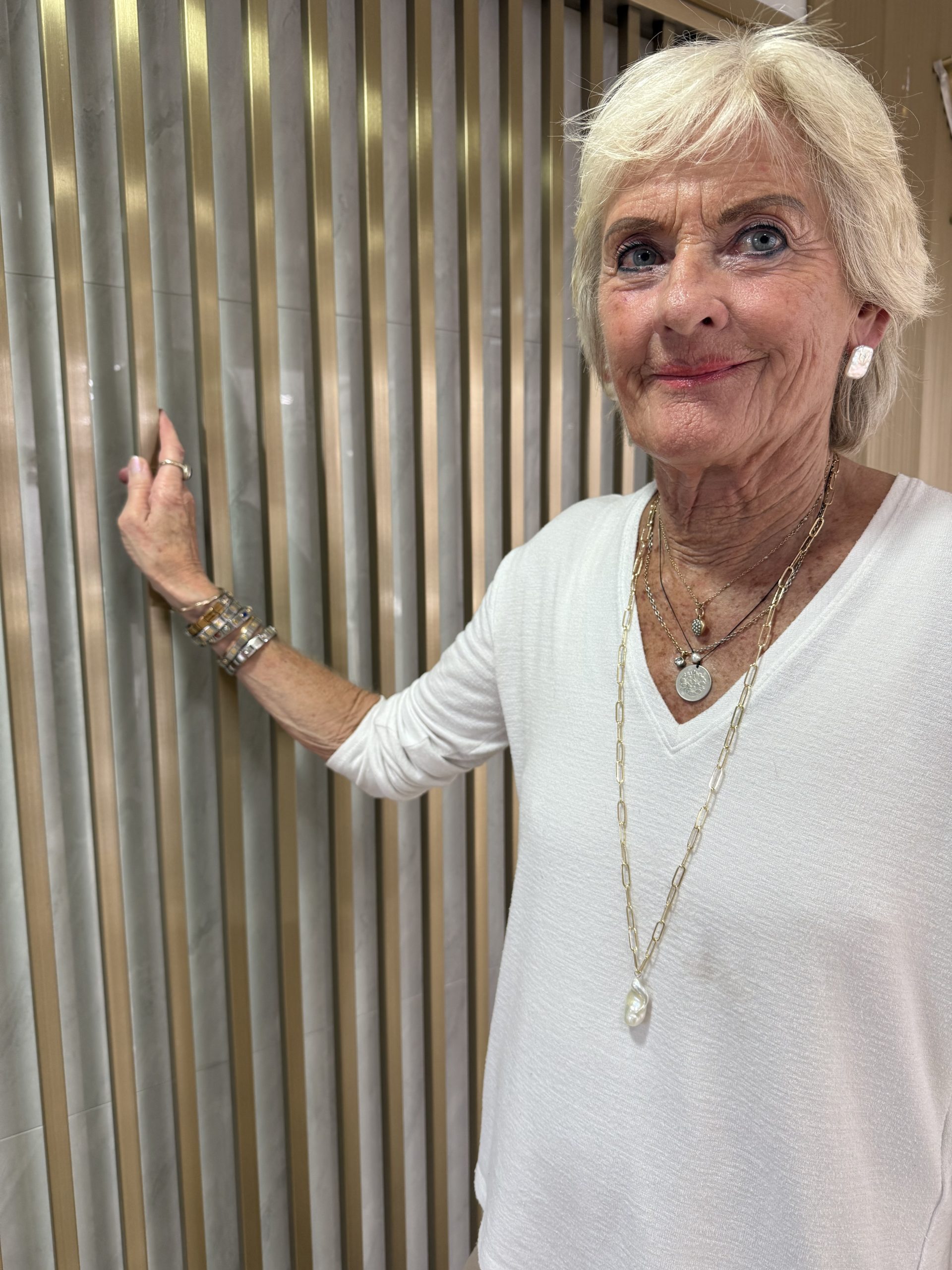 We use semi-precious stones and pearls in a variety of colours, mixed with resin, metal, silk, rubber, wood with brass or silver and leather. The jewellery is mostly to our own design and comes from China, Italy, France and UK.
